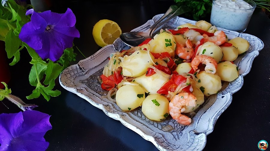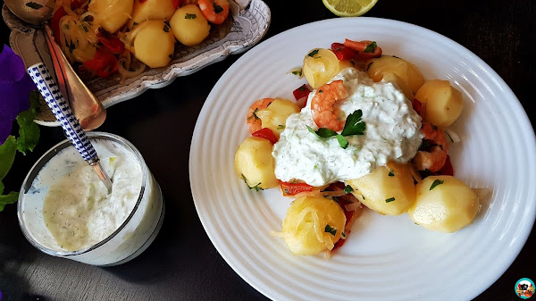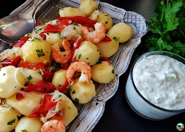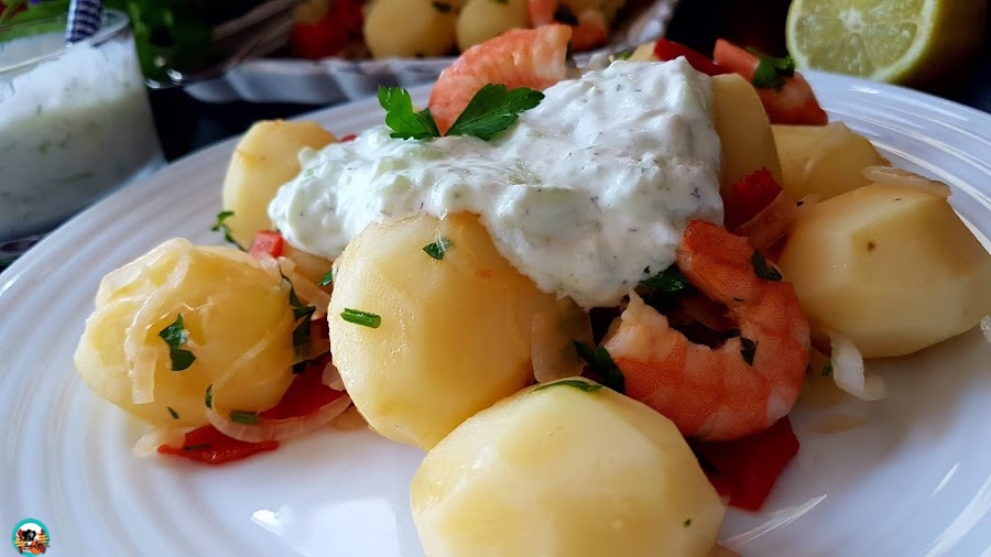 Hoy vamos a comer bien sin gastar mucho dinero ni mucho tiempo; para ello tengo esta receta de papas (patatas) con langostinos y salsa griega tzatziki.