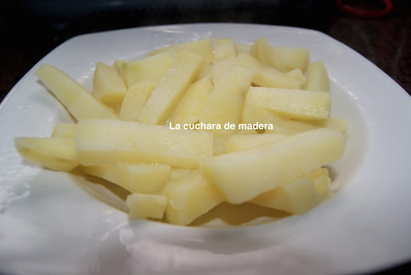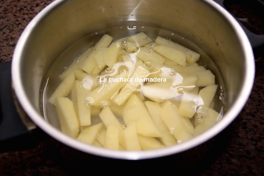 Pelar la papa y lavar, cortar a lo largo con el mismo grosor y poner en agua con 1 cuchara de vinagre. La pones a fuego medio/ fuerte unos 7 minutos.