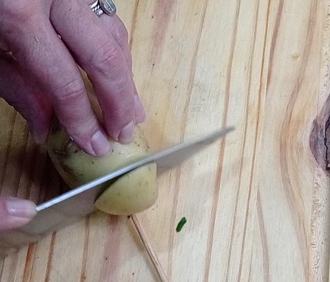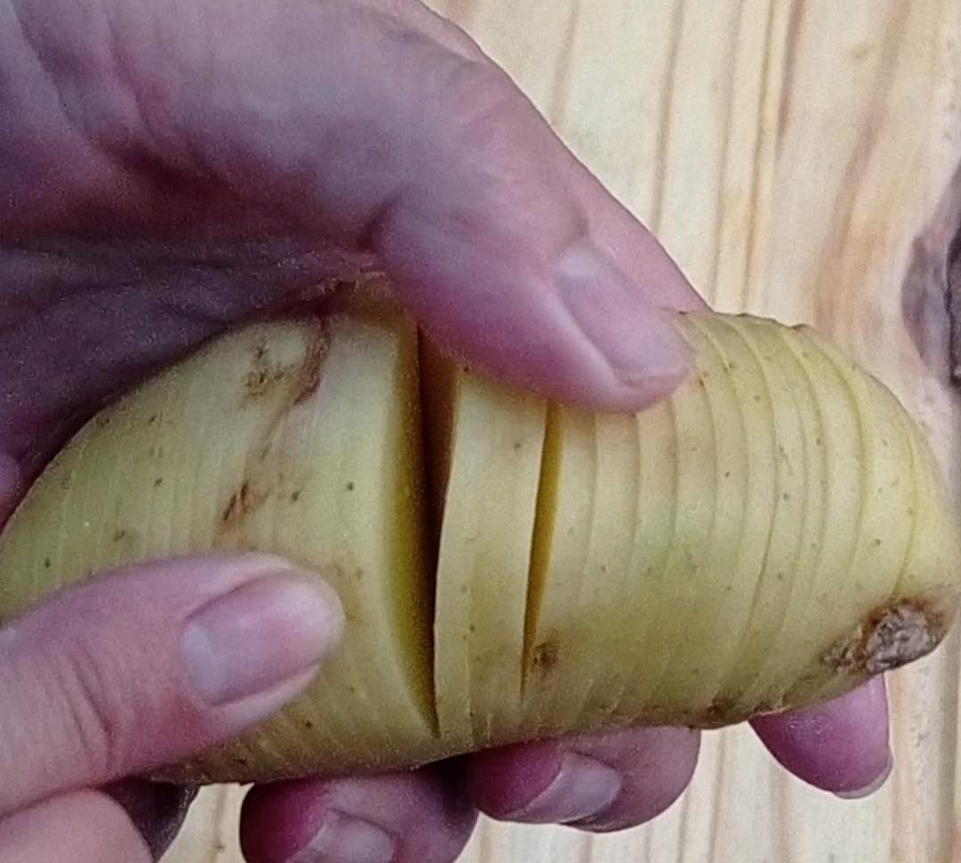 Lavamos las papas y cortamos láminas finas sin llegar al final, como un acordeón.