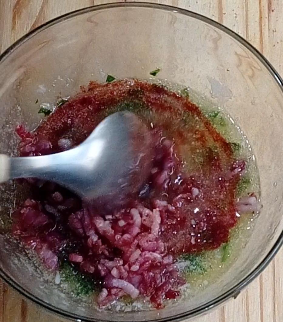 Derretir la manteca y mezclar con la panceta, el ajo picado, las hierbas picadas y pimenton.