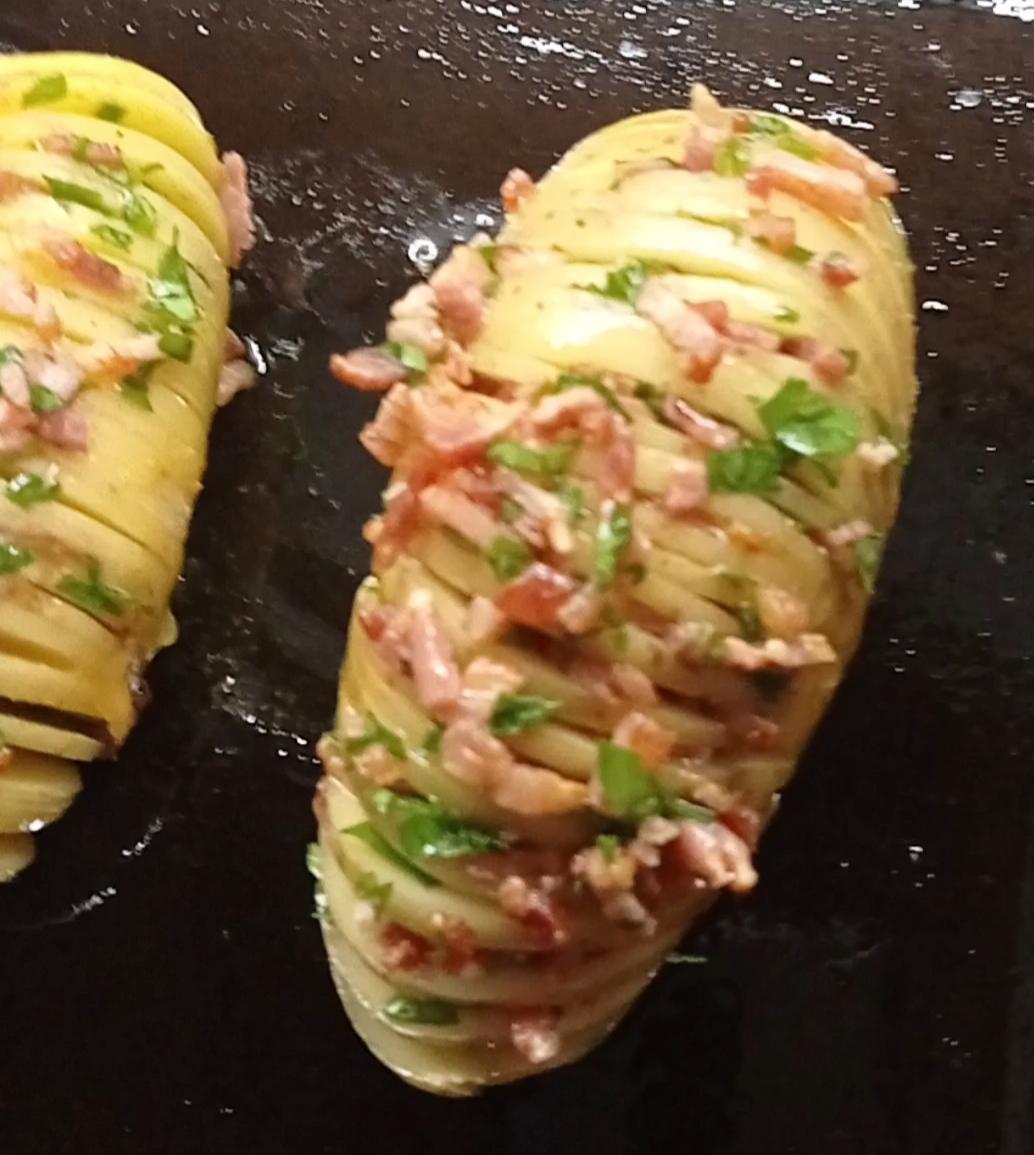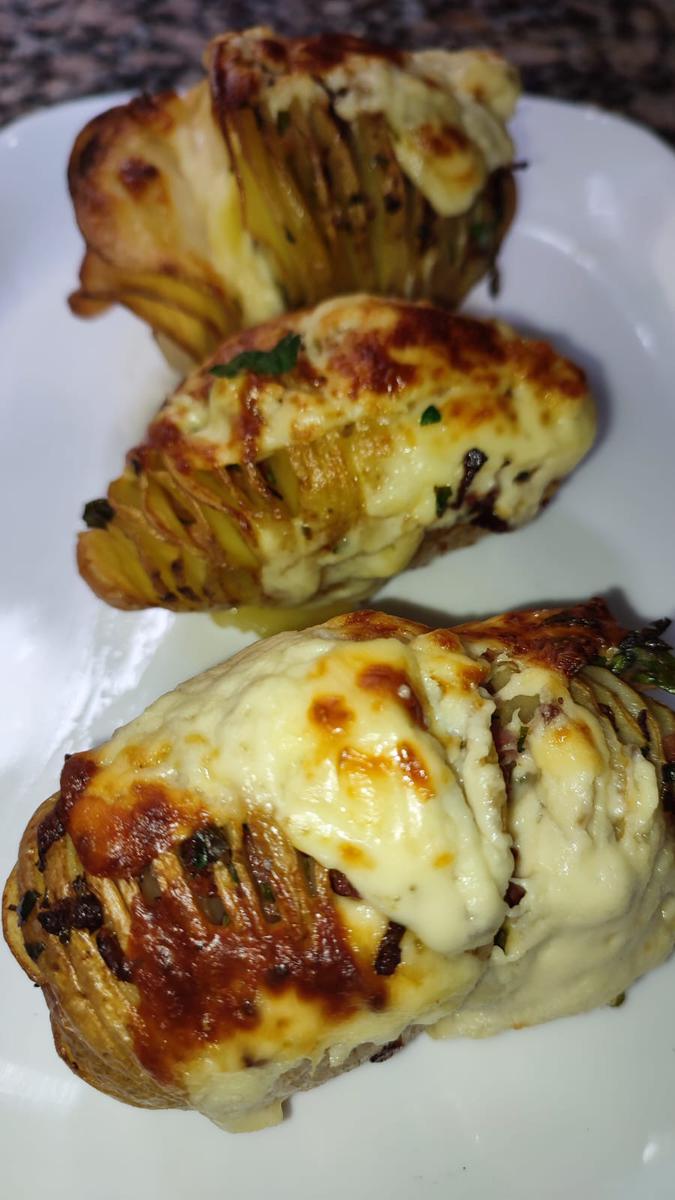 El corte tipo acordeón es lo que caracteriza estas Papas Hasselback, rellenas en cada una de sus capas y gratinadas al horno.Que plato tan rico!!! el sabor que toman las papas, rellenas en cada capa con la manteca saborizada y la panceta dorada!!!Crujientes por fuera y suaves por dentro.