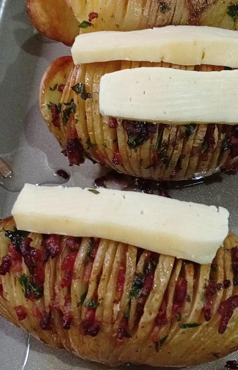 Primero cortamos las papas sin llegar al final, para ello nos ayudamos de un palillo que podemos atravesar, o tambien poniendo en cada lado una maderita para generar un límite al cortar, luego cortamos láminas finas, siempre sin llegar al final.Por otro lado saborizamos la manteca derretida, con hierbas picadas y condimentos, se puede agregar panceta dorada cortada muy pequeña.
