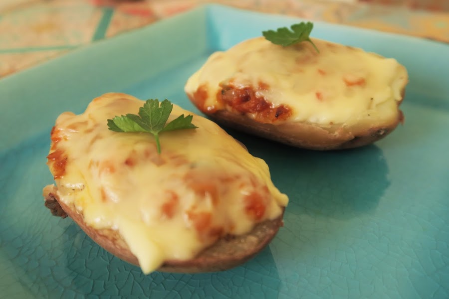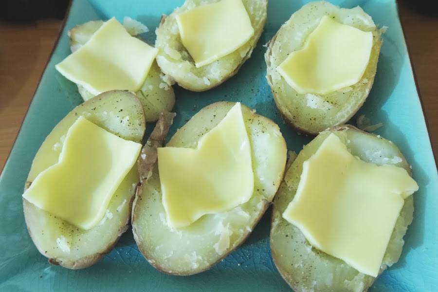 Luego, cortarlas en mitades y con ayuda de una cuchara, sacarles un poco de carne, para ahuecarlas. Añadir un poco de pimienta y poner aprox. 1/4 de lámina de queso (o al gusto) como se muestra en la fotografía.