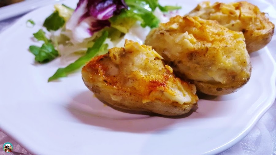 3.- Rellenamos las papas que hemos vaciado anteriormente con el puré y las setas. Añadimos por encima de cada papa un poco de queso y las gratinamos en el horno 10 minutos a 180ºC. Las sacamos del horno, esparcimos por encima un poco de pimentón y las rociamos con un poco de aceite de oliva. Las gratinamos otro 5 minutos más.