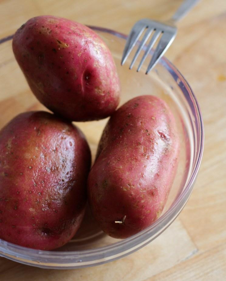 Pinchar las papas (con la ayuda de un tenedor) 4 a 5 veces por distintas partes de la papa. Calentarlas en el microondas sobre un recipiente apto durante 2 minutos para pre-cocerlas.