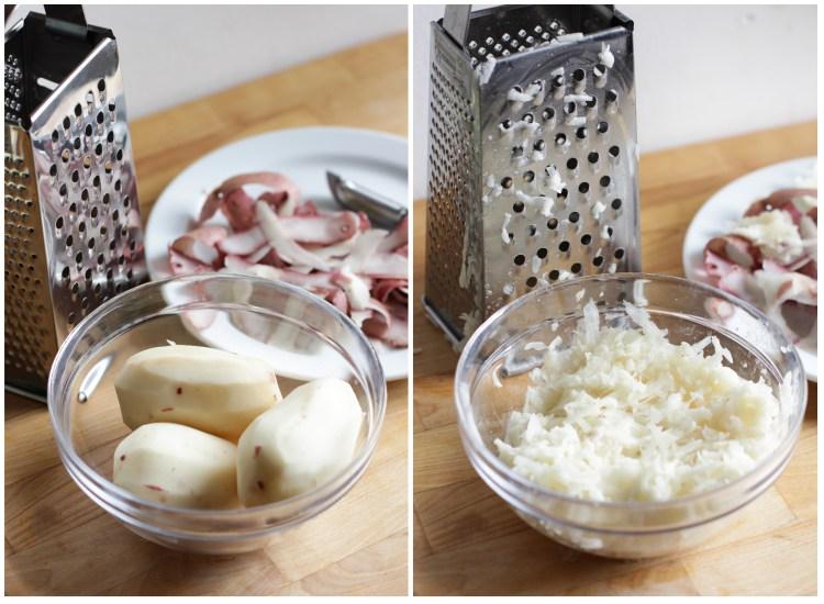 Pelar las papas con la ayuda de un pelador y rallar las papas utilizando un rallador. Si agregas cebolla, hacer lo mismo que con las papas y agregar a la mezcla.