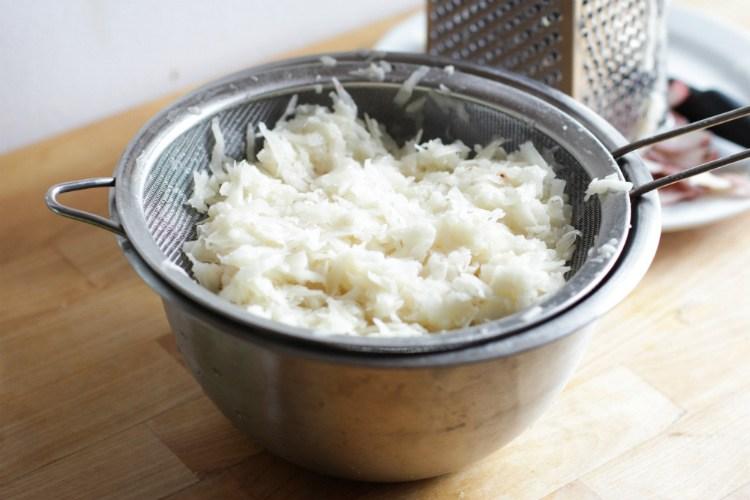 Con la ayuda de un colador, colocar la papa rallada y ejercer presión utilizando las manos o una cuchara plana para eliminar el exceso de agua.