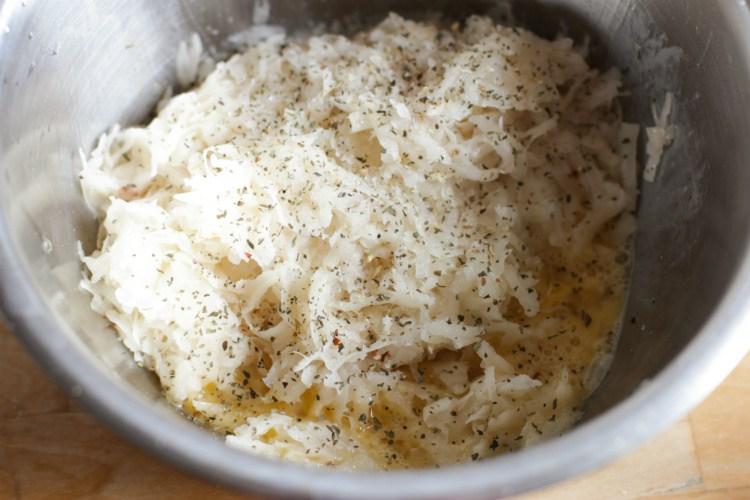Colocar la papa rallada en un recipiente y añadir 1 huevo batido, una pizca de sal, una pizca de pimienta y una pizca de orégano o albahaca en polvo. Revolver todo muy bien.