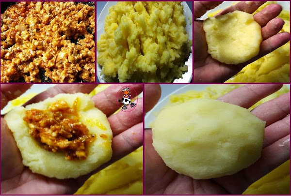 Ponemos un poco del puré de papa en las manos y con cuidado vamos poniendo el pollo,ponemos otro poco de puré de papas encima para tapar y hacemos una bola.