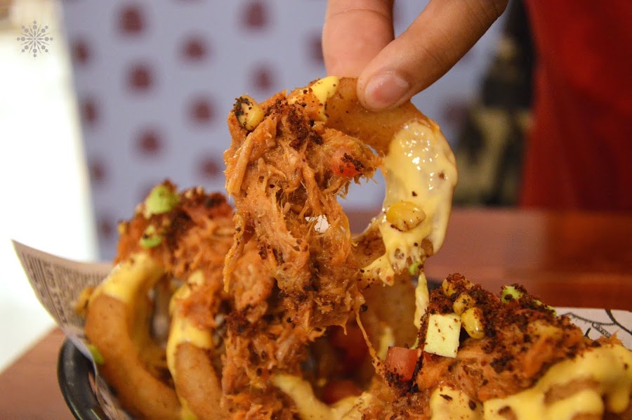 Nosotros no llegamos al postre (estábamos llenísimos!), pero sí que nos pedimos unos aros de cebolla para compartir: bañados de queso cheddar fundido, pulled pork, aguacate, tomate, granos de maíz y bacon. Estaban súper crujientes y, como veis, bien cargaditos!!!
