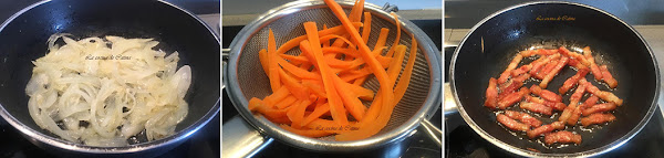 Pelamos las zanahorias y las cortamos en juliana. Las sumergimos en una olla con agua hirviendo y las escaldamos durante 1 minuto. Pasado ese tiempo las escurrimos y las reservamos.