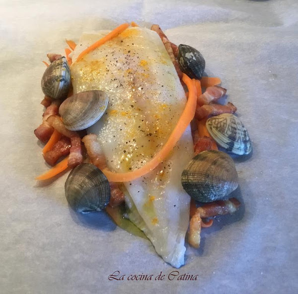 Preparamos 4 trozos de papel vegetal y colocamos encima de cada uno de ellos, una capa de cebolla y zanahoria, 1 lomo de pescado, beicon y almejas.