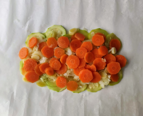 Dividimos las verduras en dos montones. Dividimos las verduras en dos montones, uno para cada paquete. Primero ponemos una cama con el calabacín, a continuación el puerro y por último las zanahorias. Salpimentamos y añadimos un chorrito de vino blanco. Ponemos encima de las verduras el lomo de salmón. Salpimentamos y añadimos un poco de orégano.