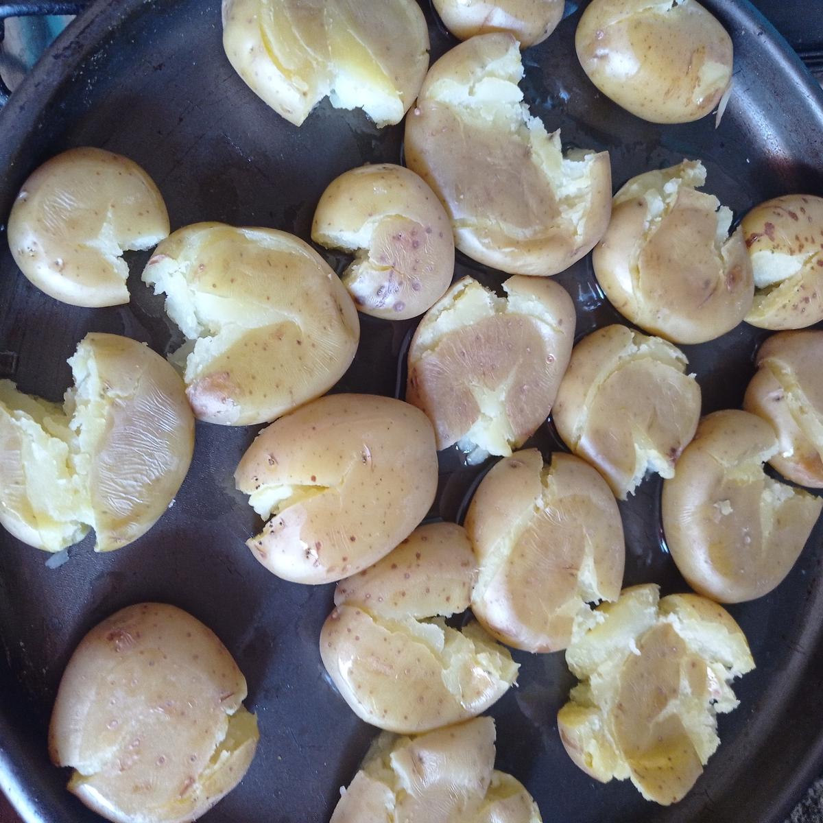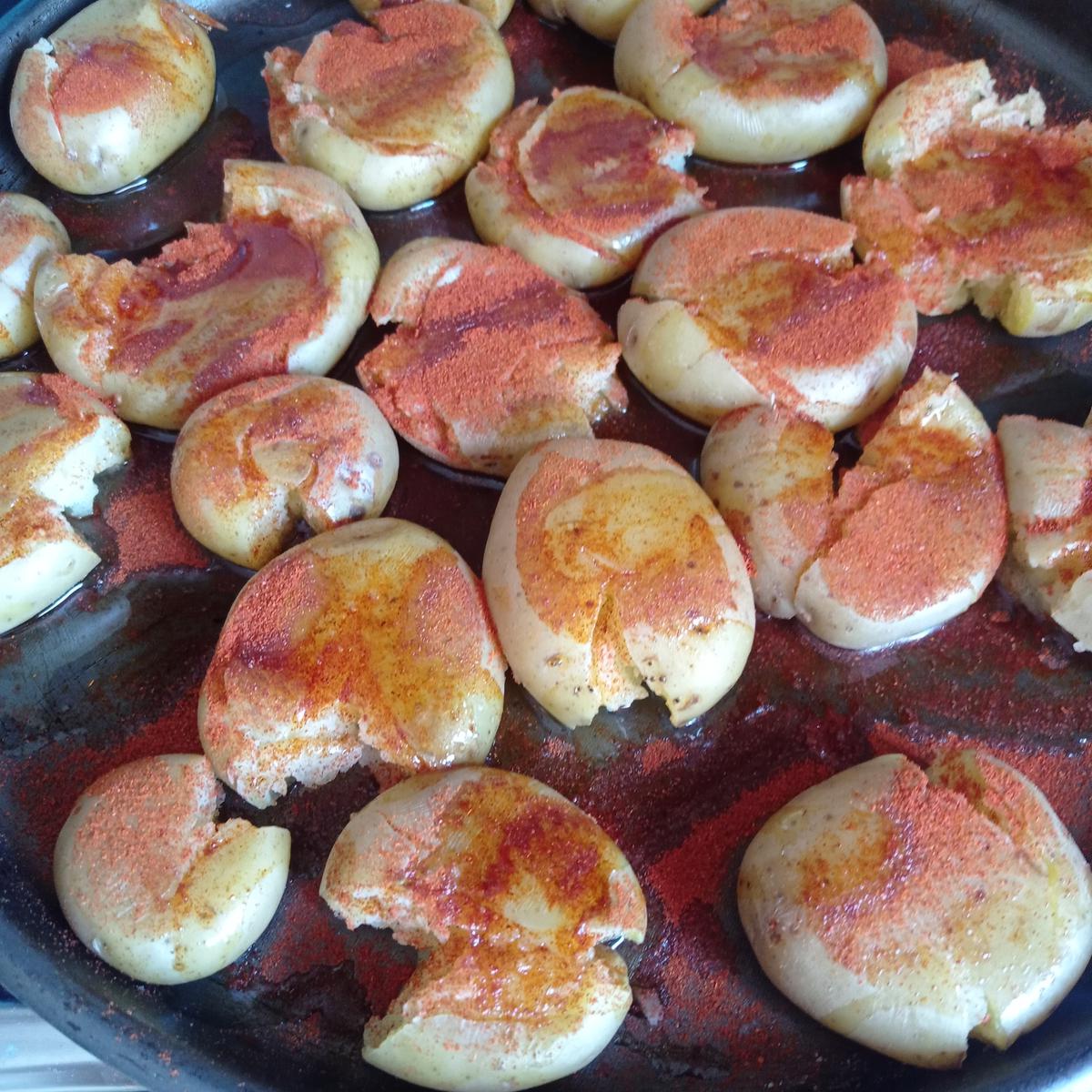 En una asadera con un poco de aceite acomodar las papas y aplastarlas, con un vaso o algo similar, pincelar con aceite de oliva y pimentón