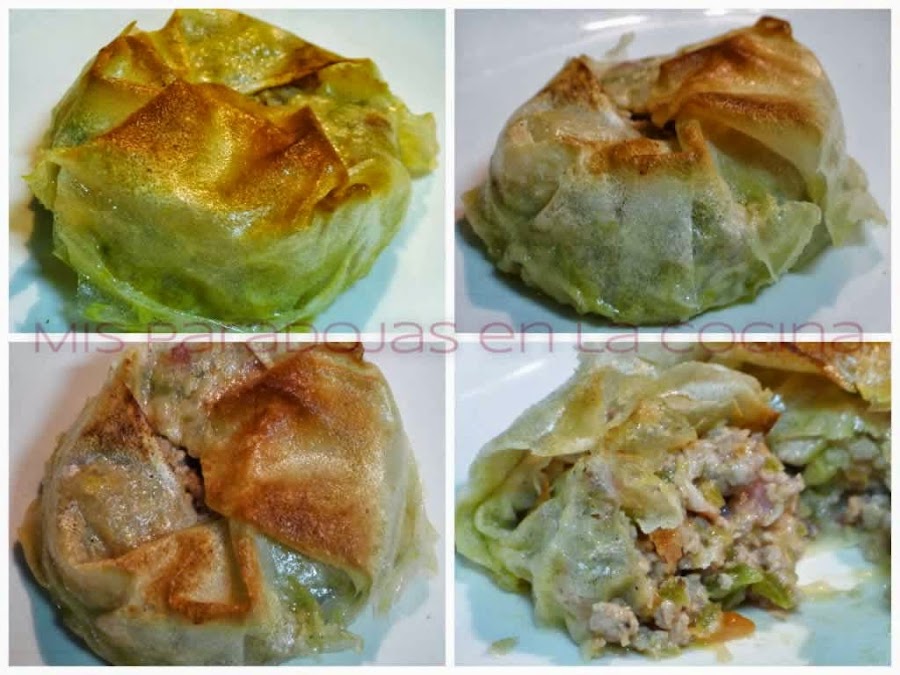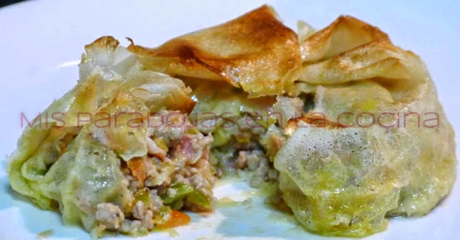 Precalentamos el horno a 180º y fundimos mantequilla al microondas. Tomamos unos aros para emplatar (tantos como paquetes vayamos a presentar) para que nos sirvan de guía e introducimos una lámina de pasta brick, rellenamos con el sofrito y cerramos el paquete pintando con mantequilla fundida. Hornear 10-15 minutos, retirar los aros y servir.
