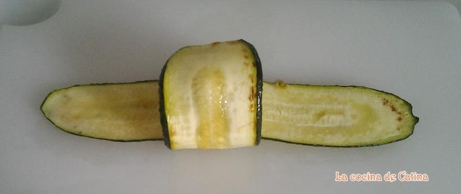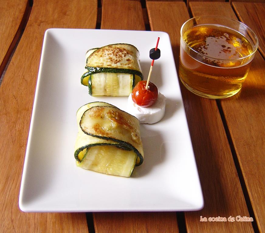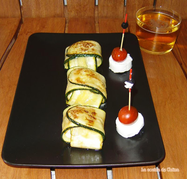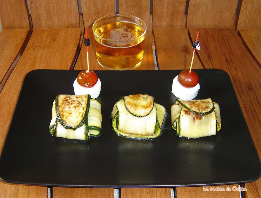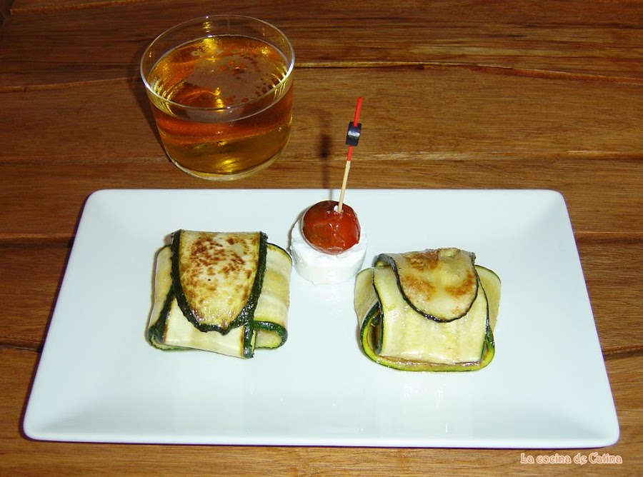 En una plancha con aceite ponemos las tiras de calabacín con un poquito de sal, y mantenerlas hasta que estén doradas, retiramos y reservamos. Hacemos lo mismo con los tomates cherry. Cuando estén todos hechos, montamos el paquetito como os indico en las fotos, cruzamos dos tiras de calabacín, ponemos una rodaja de queso de cabra y encima un tomatito cherry, envolvemos y ponemos de nuevo en la plancha, para que con el calor se derrita un poco el queso, quedando listos para servir.