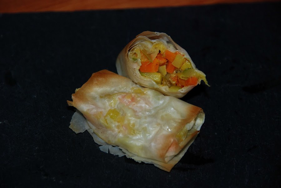 Partir una lámina de pasta filo en tres trozos y con cada rectángulo formar un rollito (no he podido hacer fotos del proceso puesto que estaba sola).