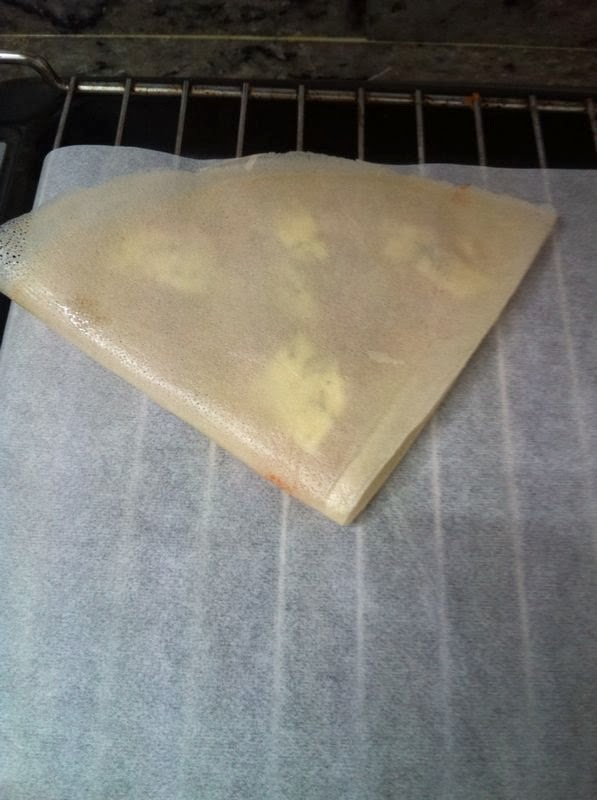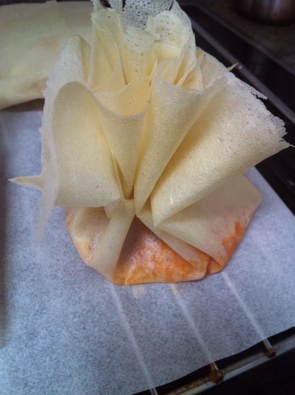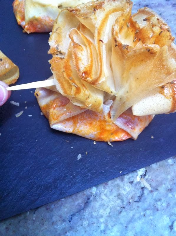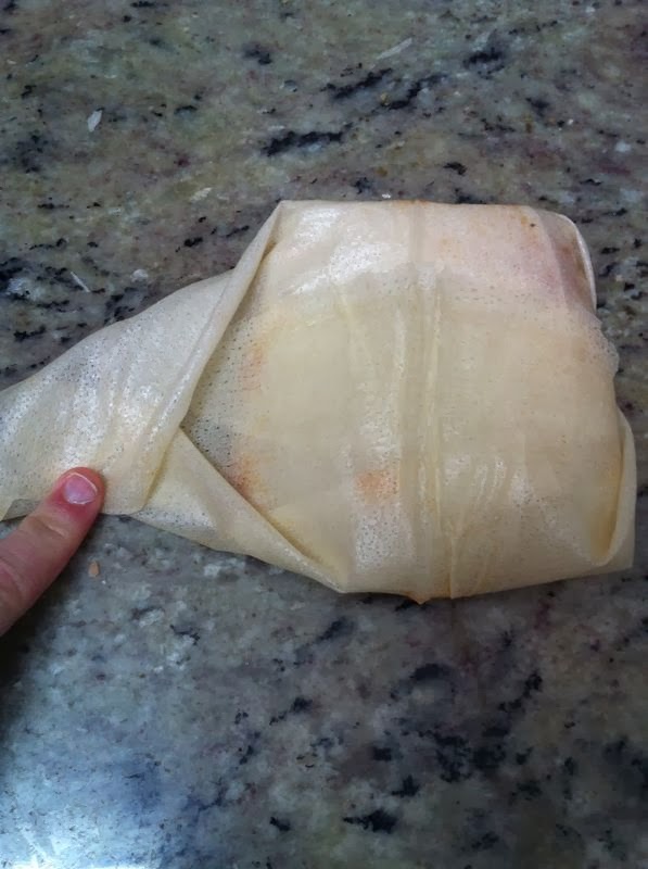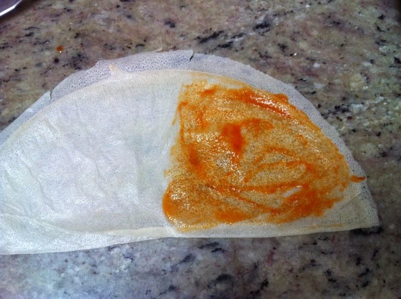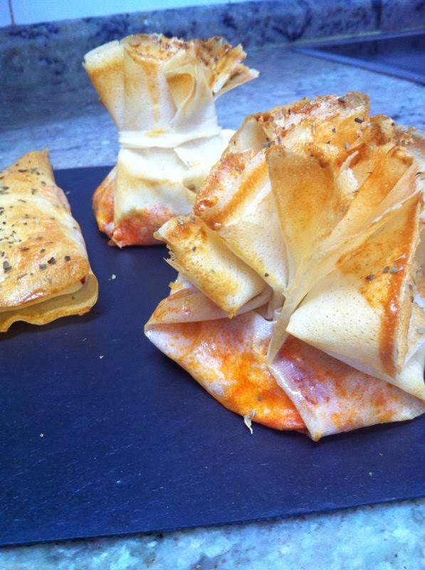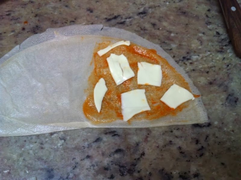 Ahora, cogeremos una lámina de pasta filo, y la doblaremos por la mitad, y pondremos salsa de tomate en una de las mitades.