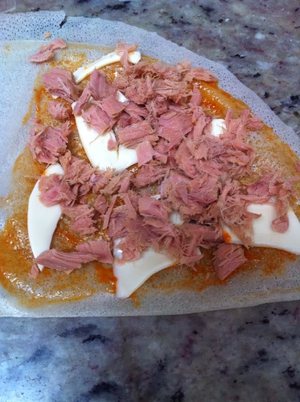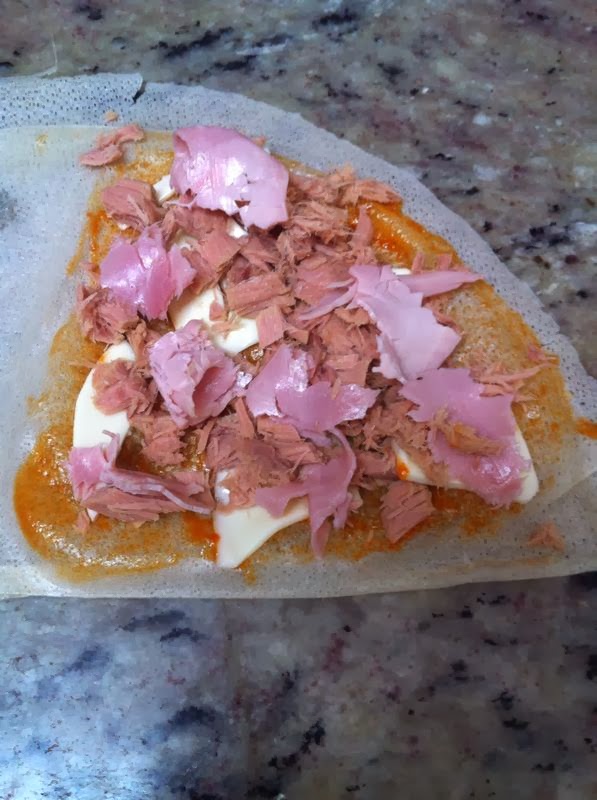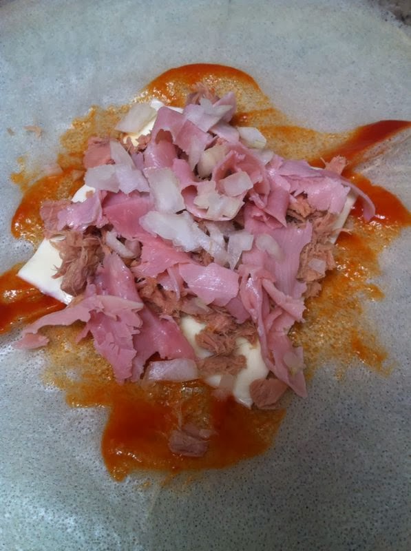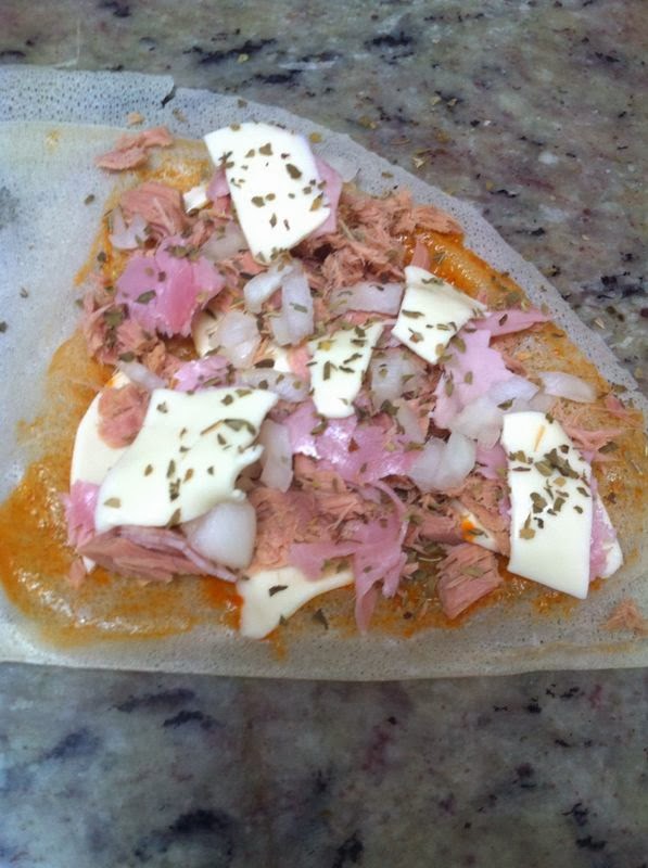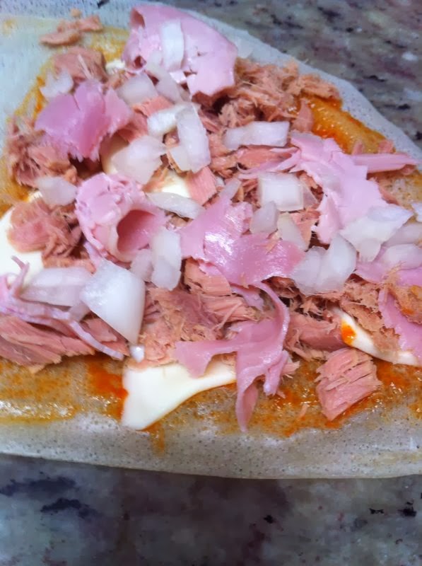 Seguido pondremos media loncha de queso, un poco de atún, jamón cocido y cebolla en crudo.