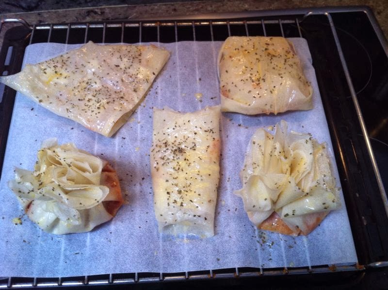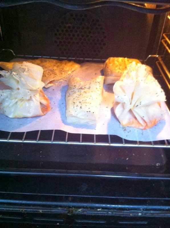 Y mientras se calienta, untaremos con un huevo los paquetitos para darles brillo, y espolvorearemos con un poco mas de orégano.