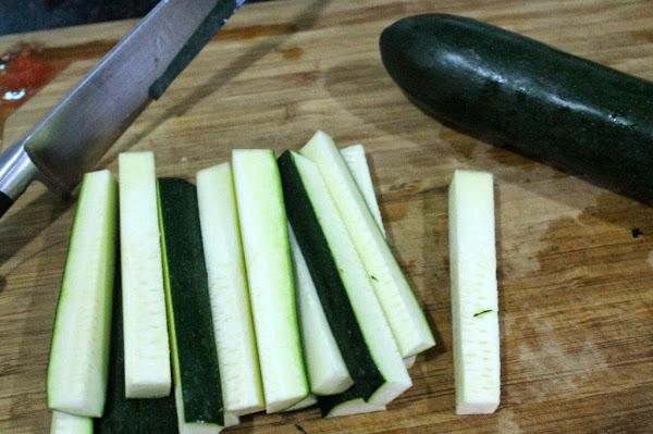Limpiamos los calabacines y cortamos en bastoncitos. No se tienen que pelar.