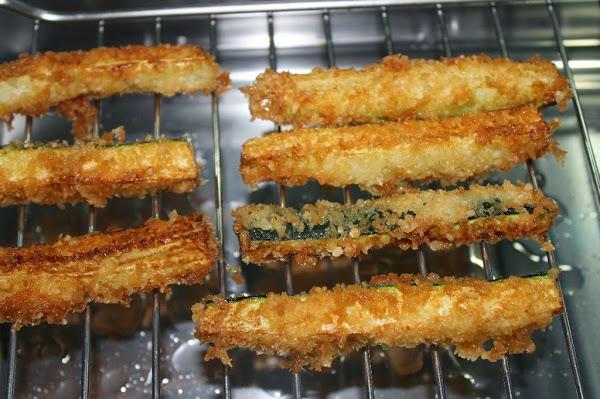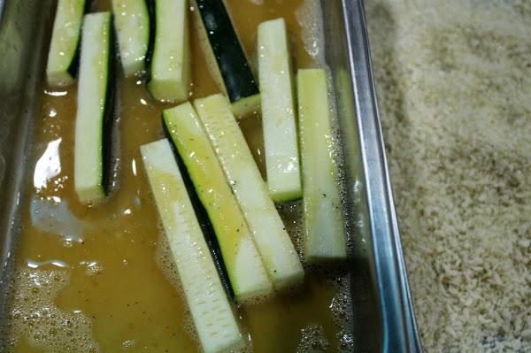Secamos un poco los calabacines, los pasamos por el huevo batido y luego por la mezcla de panko y parmesano.