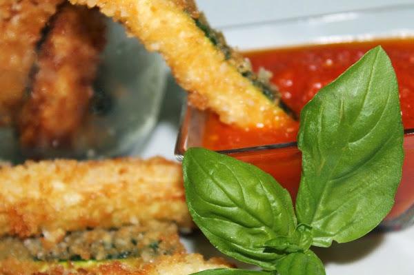 Servimos calientes con salsa de tomate aparte, pimienta recién molida por encima y albahaca picada por la salsa y los calabacines.