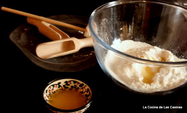En un bol amplio tamizas la harina junto con la levadura, viertes las 2/3 partes de la mantequilla clarificada, la sal y añades poco a poco el agua mientras que vas amasando.