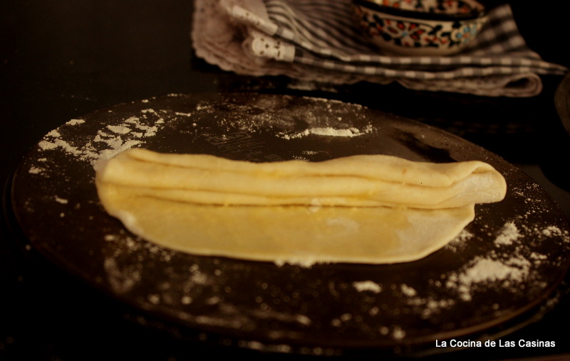 Espolvoreas la encimera con harina, aplastas con el rodillo cada una de ellas formando un círculo. Pincelas con la mantequilla y doblas la masa con dobleces sobre sí mismos, hasta formar una tira.