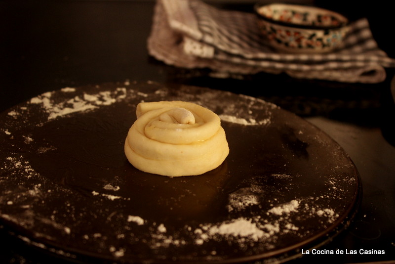 Aplastas y estiras cada una de ellas, envuelves formando una espiral.