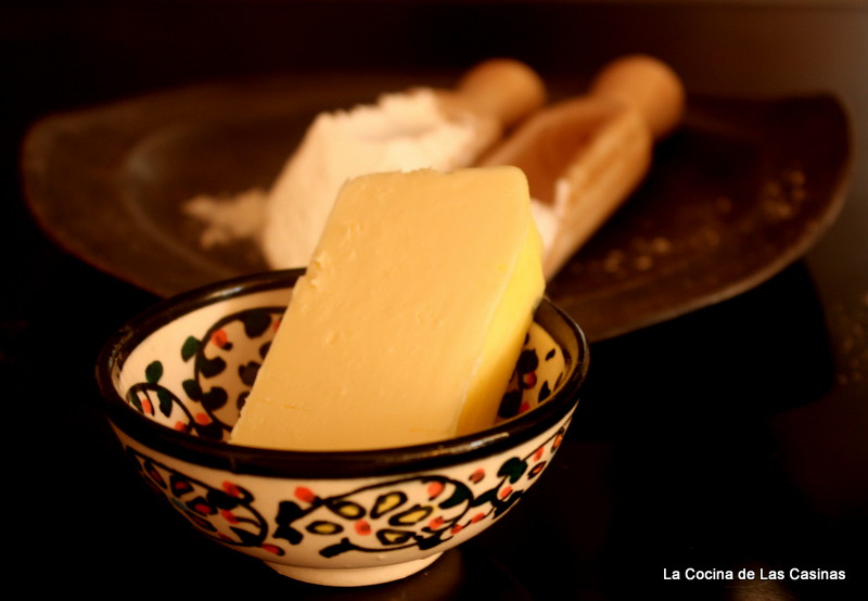 Pasas el rodillo hasta conseguir un círculo de 0,5 mm de espesor. Pincelas con mantequilla.