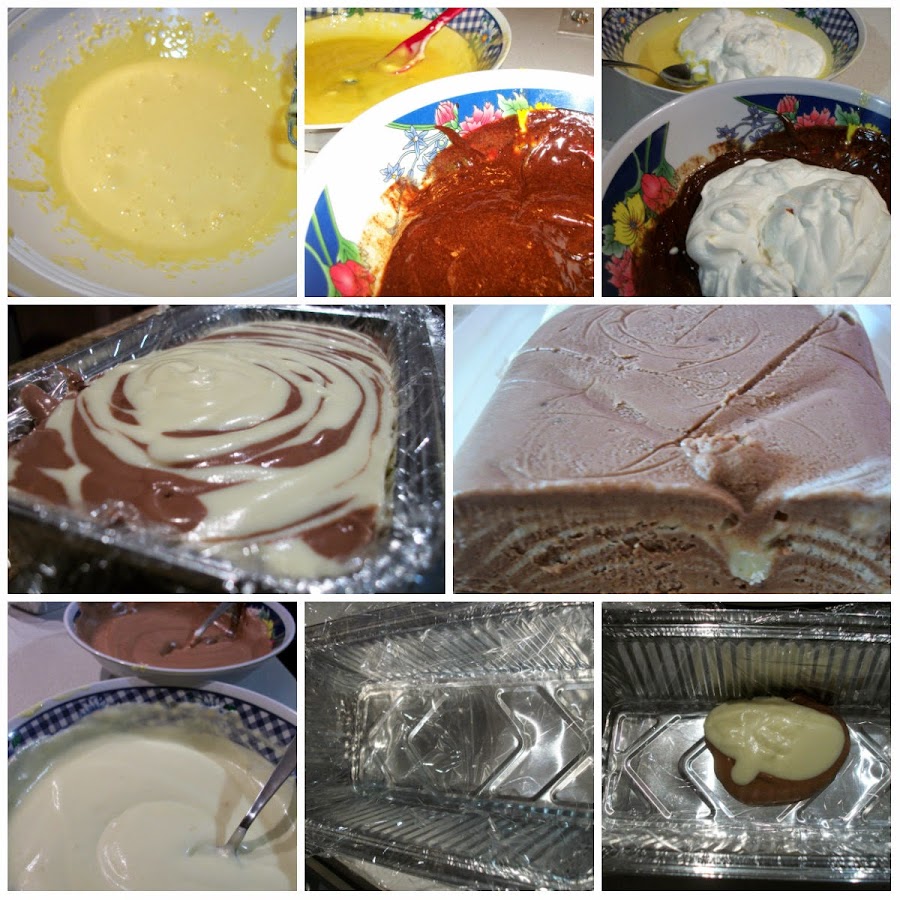 Divide la mezcla en dos recipientes a una le agregas el chocolate negro derretido y a la otra le agregas el chocolate blanco derretido.