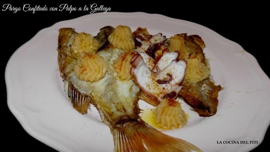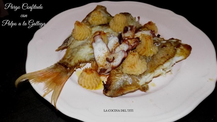 Hoy toca Pargo confitado para los que desconoceis se trata de poner en aceite el pescado a temperatura entre 50 a 60 grado nunca que nos llegue a humear y el tiempo depende de lo que vayamos a confitar pero mas o menos va entre unos 15 a 30 minutos pero el blanqueado del pescado es el indicador para saber que el pescado esta terminado. Lo acompañaremos con pulpo y de guarnicion una crema de patata que os va a encantar por la elegancia que le va dar a la receta.