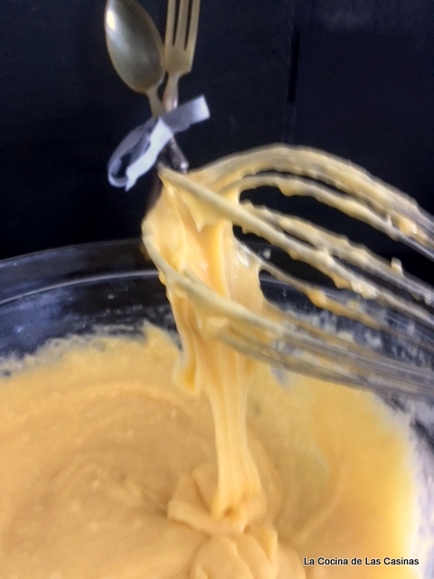 Bates con la espátula de madera o con las varillas y retornas al fuego, trabaja la masa hasta que se desprenda de las paredes.