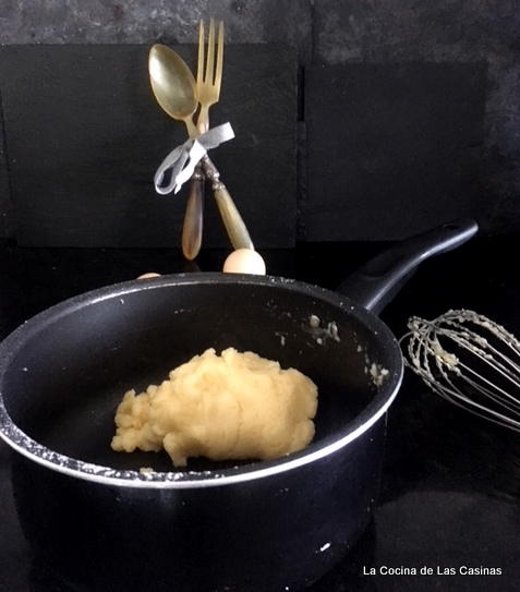 Retira del fuego, añade de uno en uno los huevos, cuando la masa haya absorbido uno, incorporas el siguiente, reserva un poco del segundo para pincelar la masa junto con una cucharada de leche.