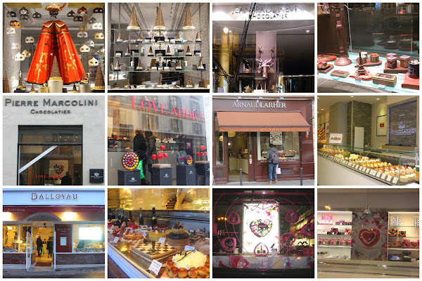 Estas pastelerías son: les Marquis de Ladurée (tienda dedicada exclusivamente a creaciones con chocolate... espectacular!); Jean Paul Hévin Chocolatier (el escaparate lo dice todo... nunca antes había visto figuras de ese tamaño hechas únicamente con chocolate... lo quiero para mi cumpleañoooooooooooooos!); Pierre Marcolini Chocolatier (otra más para el clan... dios mio!); Arnaud Larher (mi chico me prohibió comprar más... en ese mismo momento llevábamos 3 BOLSAS con dulces de otras pastelerías jajajajaja); Dalloyau (muy conocida y con pasteles de una pinta impresionante); Fauchon (un templo respostero inmenso).