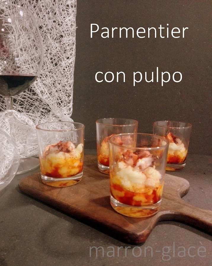 5.- Rellenar cada vasito con el parmentier y colocar uno o dos trozos de pulpo.Espolvorear con pimentón dulce o picante.