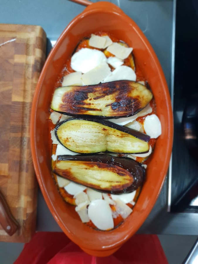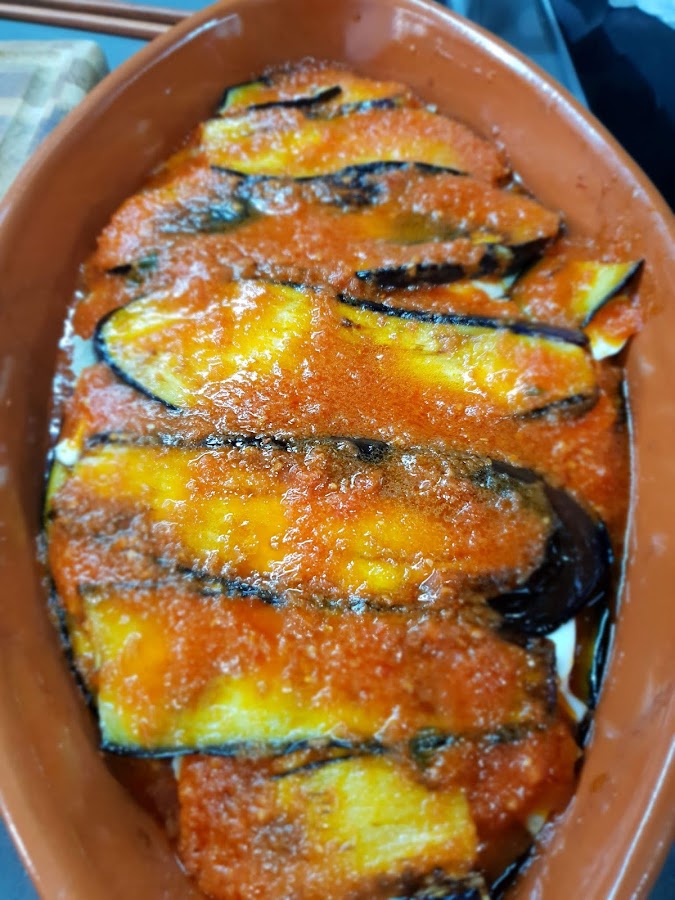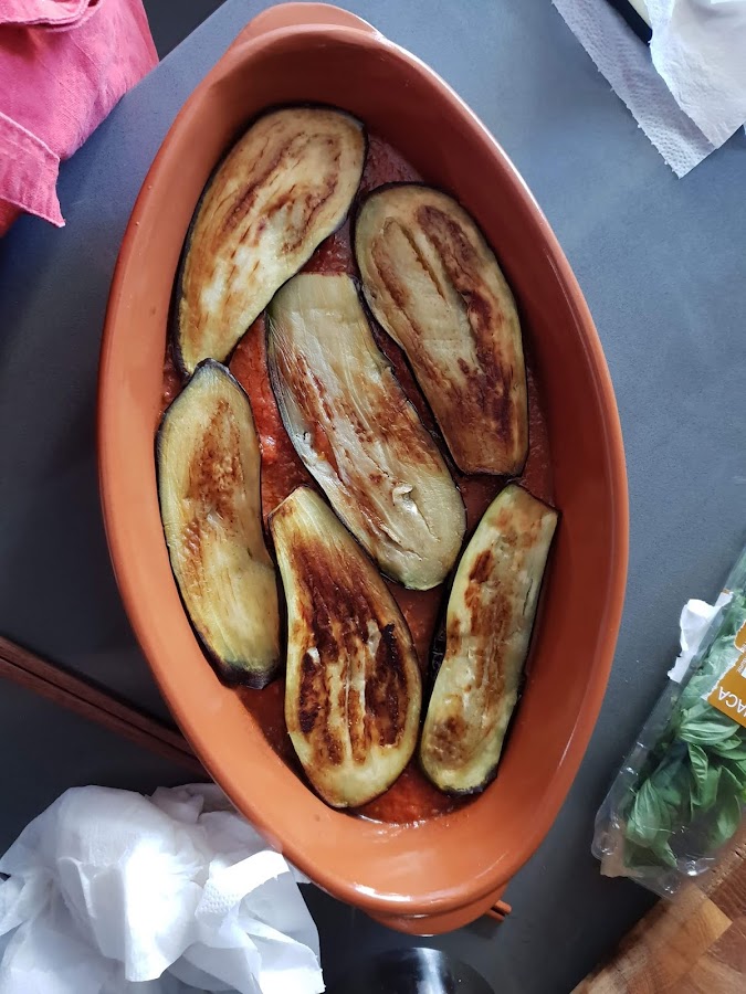 Yo le puse 3 capas de berenjena. Siempre la última tendrá que ser de tomate y parmesano por encima, para que cuando la metemos al horno se quede la costra rica de queso crujiente.