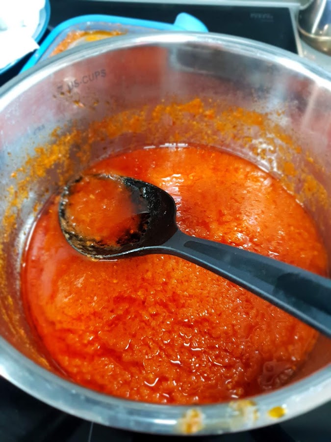 Haremos tomate frito casero, le dará ese punto de acidez característico. Aquí tenéis una antigua receta mía. Sino,como comentaba antes, si os da pereza se puede usar de bote. Si os ponéis, hacéis varios kilos y tenéis para muchas veces.
