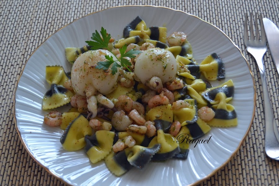 Ponemos la pasta en el plato y echamos por encima las gambas y las sepias y añadimos un poco de salsa de aceite ajo y perejil y listo.