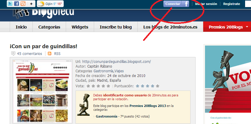 Una vez registrado, ya puedes votarnos, lo más fácil es que vuelvas a pinchar el enlace del paso 1 que te lleva directamente a la ficha del blog sin necesidad de navegar. Ve al paso 4