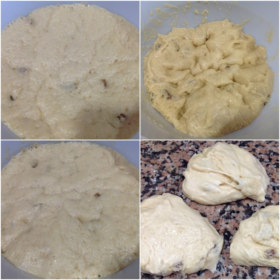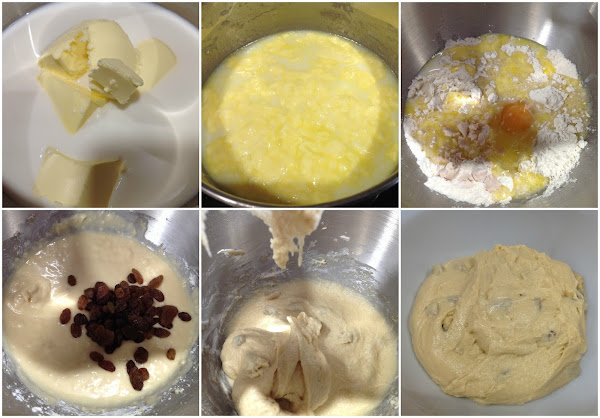 Ponemos en un bol la mitad de la harina, el huevo, la mezcla de leche y mantequilla y añadimos al levadura desmenuzada. Mezclamos integrand los ingredientes y agregamos las pasas de uva y el resto de la harina. Amasamos unos 10 minutos, hasta obtener una masa suave y un poco pegajosa. La colocamos en un bol engrasado con aceite y cubrimos con papel film o con una bolsa de plástico. Dejamos descansar en un lugar cálido, lejos de corrientes de aire, durante 2 horas aproximadamente. Yo suelo ponerlo dentro del horno apagado.