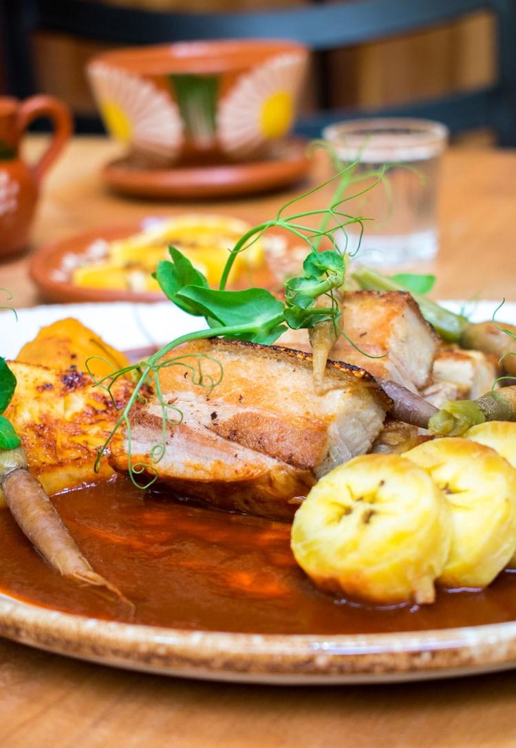Pancetta en manchamanteles con puré de camote y plátano macho La carta ofrece todos los clásicos que esperarías en un lugar así; desde tlayudas y chapulines hasta los moles tradicionales. Lo más importante es, sin embargo, los productos que forman los platillos: muchos de ellos vienen directamente desde oaxaca, como el quesillo, el tasajo, la hierba de conejo o el maíz bolita. Este último, es esencial en Pasillo de Humo; la masa y todos sus derivados son el eje central (literalmente, en el centro del restaurante y a plena vista está el comal trabajando a todas horas). La molienda y el nixtamalizado se realizan en la cocina, de forma artesanal.