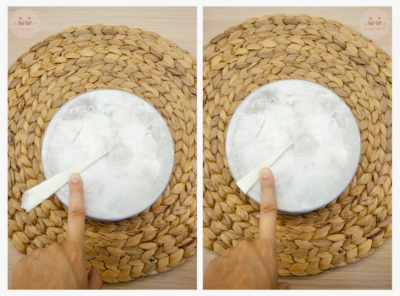 Nota 2: Para fijarlo bien a la base de nuestro molde de manera que no se mueva ni se formen arrugas, engrasaremos previamente la base con un pincel de repostería. Después, pondremos el círculo de papel de hornear encima de la base y lo engrasaremos también.