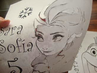 Realizamos un dibujo a mano sobre papel mantequilla, o bien, en la computadora, sólo hay que imprimirlo del tamaño deseado, si el pastel es muy grande, entonces lo imprimimos en mosaico o en partes, y acomodamos el diseño como queramos que quede el pastel, esto nos servirá de molde. Existe el papel de arroz que es comestible, y los colores comestibles también, con el que muchas personas se auxilian para realizar estos decorados de pastel, sólo se coloca sobre el pan embetunado y se va decorando encima, como es comestible no hay problema, pero yo prefiero hacerlo del modo tradicional... sin papel arroz...