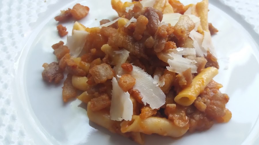 La pasta a la amatriciana, es un plato muy típico italiano, originario de la localidad de Amatrice, en la región de Lacio, y tristemente conocido porque ha sido una de las regiones más devastada por el terremoto de éste verano. La receta de pasta que os traigo, se convirtió en un símbolo, porque muchos restaurantes de todo el mundo, donaban 2 euros por cada plato de pasta a la amatriciana que servían. Massimo Bottura dona 5 euros cada vez que lo piden en su restaurante. Él hace una variante, y es que le echa vinagre de módena, que no lleva la receta original, y así lo he hecho yo. y no le he puesto la pasta mezze maniche, que no he encontrado y tampoco guanciale, que es una especie de panceta, pero hecha con careta o carrillos, se puede sustituir por la panceta nuestra.