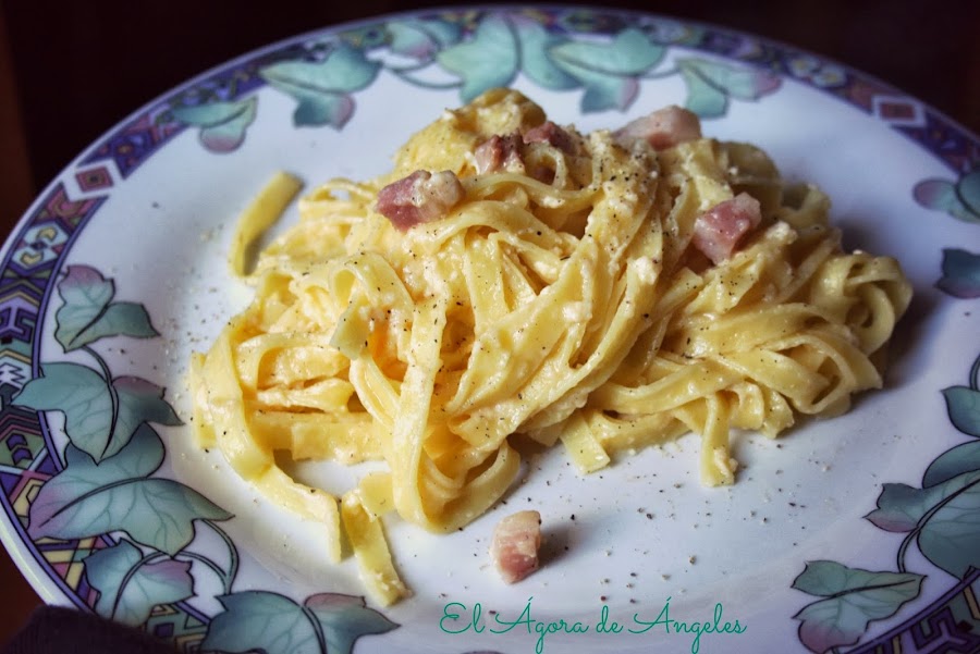 No sé en qué momento, la carbonara ha dejado de hacerse así para sustituir los huevos por la nata (crema de leche), pasando así a ser una receta llena de calorías innecesarias.