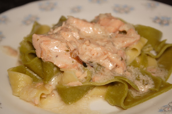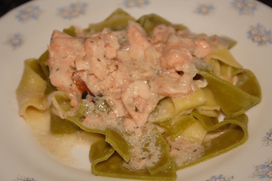 Una vez cocida la pasta, escurrimos bien, servimos en los platos y regamos con nuestra crema de salmón.