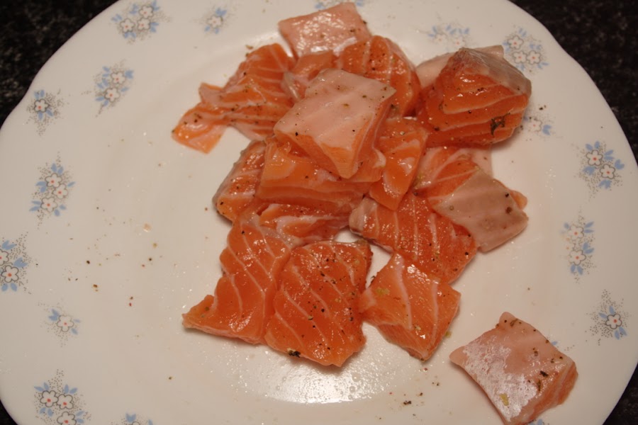 * 500 gr de de salmón en tacos, sin piel ni espinas.