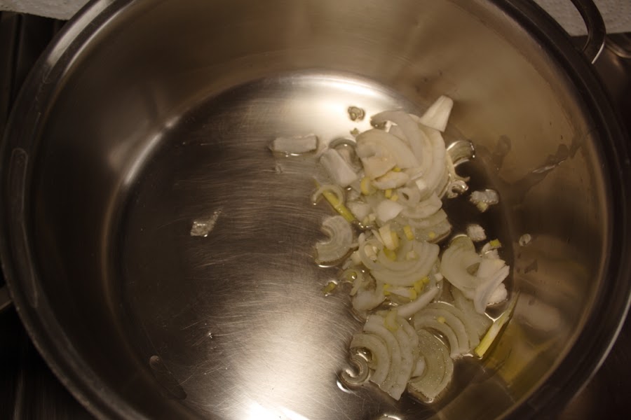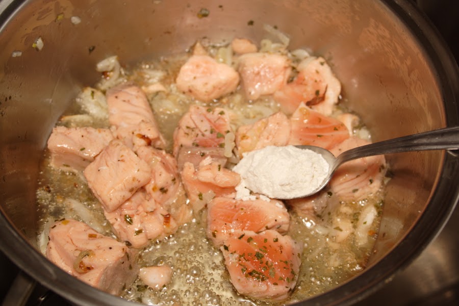 En una olla baja y ancha, ponemos aceite de oliva y colocamos al fuego, echamos la cebolleta, que se vaya pochando. Antes de que se dore añadimos el salmón, rehogamos unos minutos (no mucho tiempo porque se pasa demasiado). Espolvoreamos la harina y removemos para que se cueza.